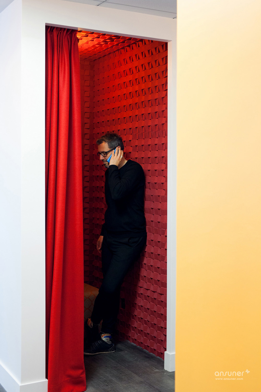 然而跳跃的色彩和当代设计又把你拉回到现实之境。比如大会议室长桌上方那些有趣的绿色植物、昏黄的球灯以及一旁书架上五颜六色的书籍;由印度 Yoga House 创始人 Maud Chuffart 指导设计的玫红与粉紫相间的瑜伽冥想室;红色天鹅绒与彩色软木块装饰的私密电话间;被称为“糖果沙龙”的休息区里那些荧光色系;顶楼露台上红色的长沙发等。