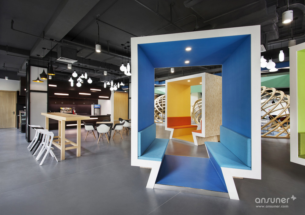 整个中庭为本案的亮点。设计师利用建筑的结构优点,并为了更好地展示出每层的特色,采用了腾讯文化中的几个主色调,不同的色调代表着每层的空间色彩效果。为了使中庭的空间感更为突出并结合设计理念中的造型元素,每层楼板外立面及柱体,都运用了立体式折线的效果。从中庭对应的一楼休闲区也设计了三组采用地球轴线组合而成的有趣的休闲讨论区,既有开放的效果,又有一定的分割隐私作用。