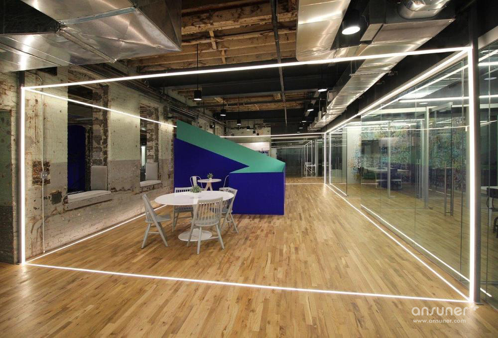 这处面积约4330平方米的联合办公场地,位于布鲁克林区的郭瓦纳斯(Gowanus),一个成熟的工业区。近年来对城市基础设施的改造与建设让这里恢复了社区活力,涌现出大量艺术家的工作室、潮流餐厅和公寓大楼。沿着郭瓦纳斯运河,随处可见临时搭建的艺术画廊和另类音乐场所。