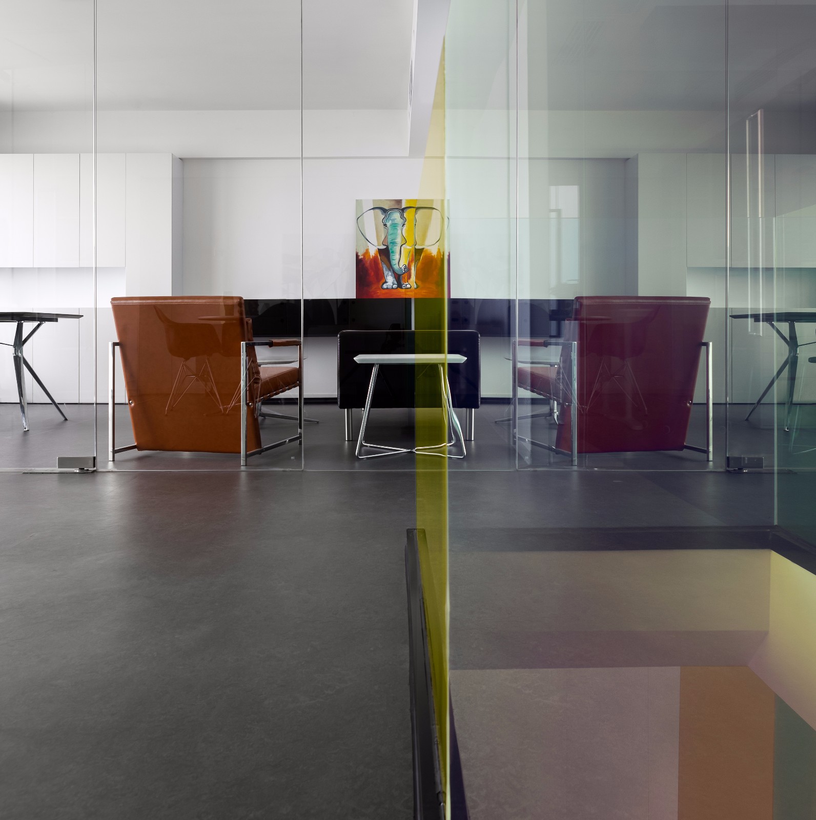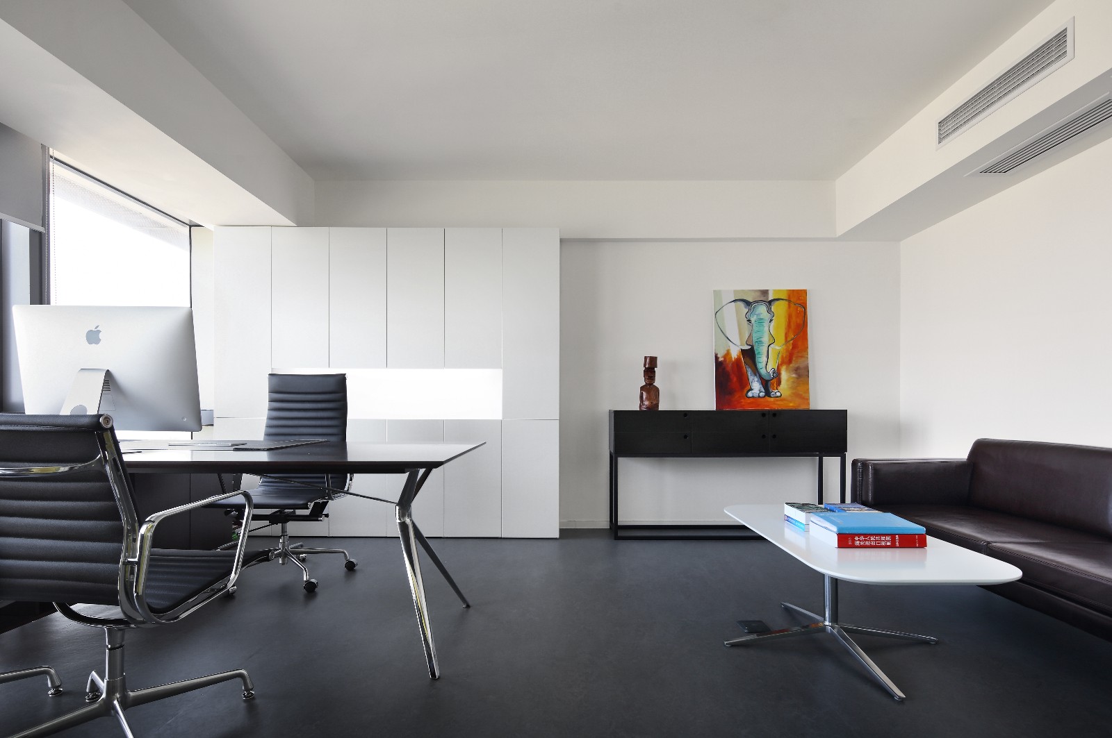 办公室内全部采用透明玻璃隔墙,最大限度的引入自然光线,并起到很好的隔音效果。左侧是洽谈区,右侧,设计师巧用原始建筑落差,在储物间门边设置了吧台,二者功能分开又相互结合。重要客户在此可以伴着红酒、咖啡促膝长谈。