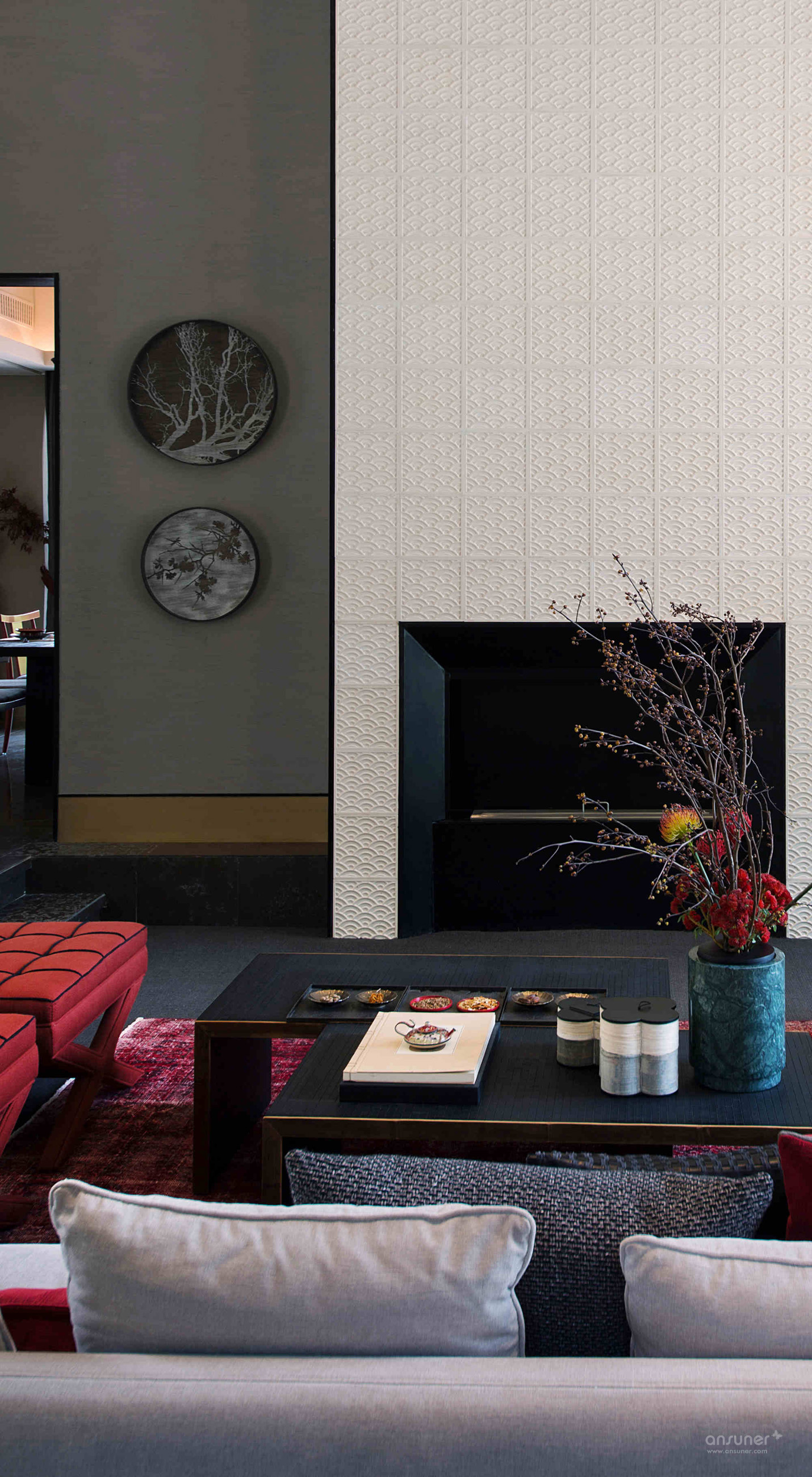 客厅:软装设计上,色彩浓重与用材粗放的矛盾组合,不拘一格,在隐藏的静室之下掺杂了强烈而又煽情的色彩视觉。细节处低调嵌入优雅的中国传统纹样,以打破重组的独特手法,在空间里造成恰当的碰撞,粗粝的花樽中,娇俏的花枝摇曳,明艳中还带有丝丝缕缕的纯真。