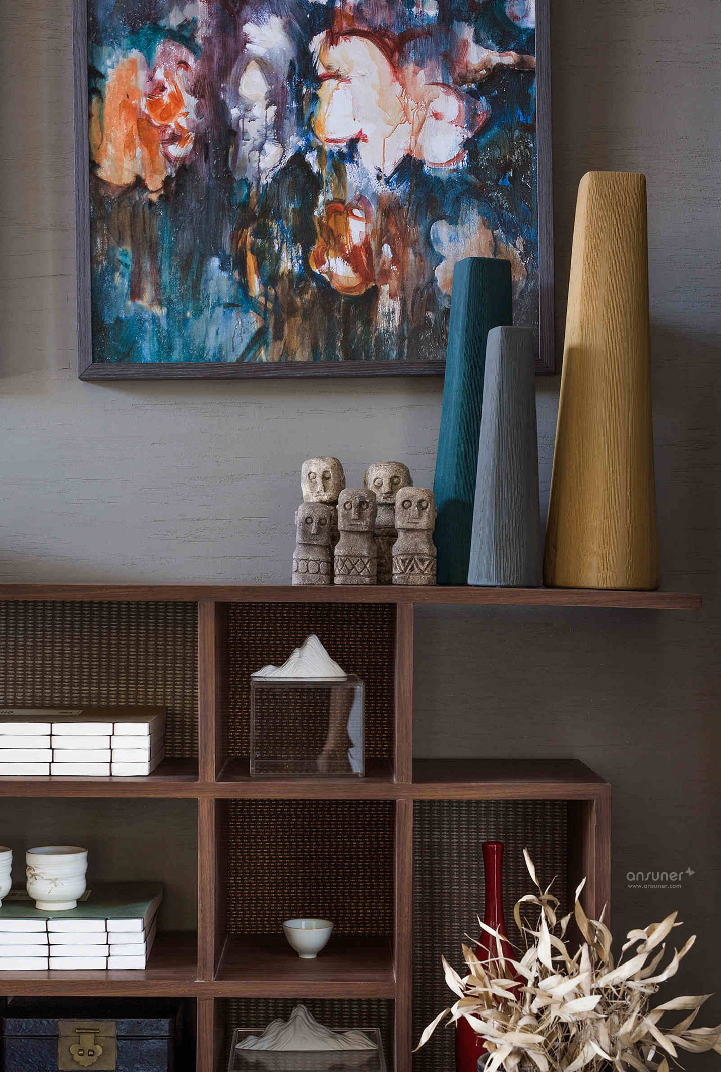 餐厅:餐厅延续了客厅的设计格调,捕获繁华绚烂中的一片宁静详和。青黑色的木桌、朱砂红的木制座椅、黑釉陶罐花樽,设计师运用意象叠加的手法,烘托出就餐区源自古老的韵味和踏实的生活情调。来自青年艺术家王志新的《花团锦簇》,极具张力的色彩与整个空间浑然一体。