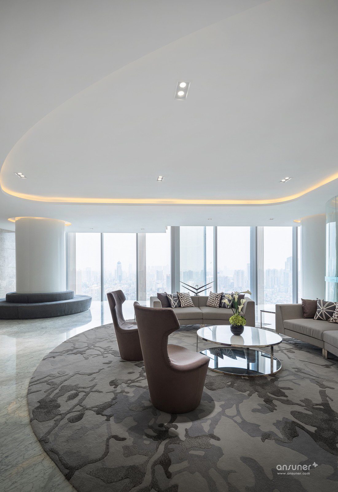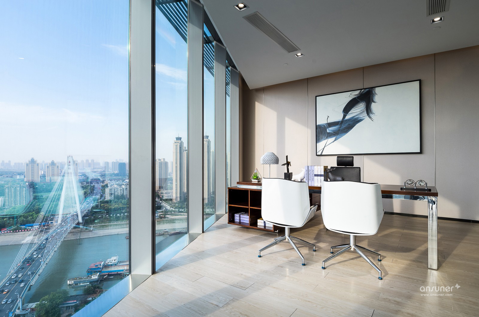 武汉越秀财富中心为华中地区位居第三的高楼,总高330米,地处武汉汉口核心地段,内环线西顶点,承武广,临汉江,居百年大道一中山大道之源。项目位于22楼的办公示范间,为营造一个既开放又相对独立的办公空间,设计以黑、白、灰为主色调,空间以圆弧玻璃划分。