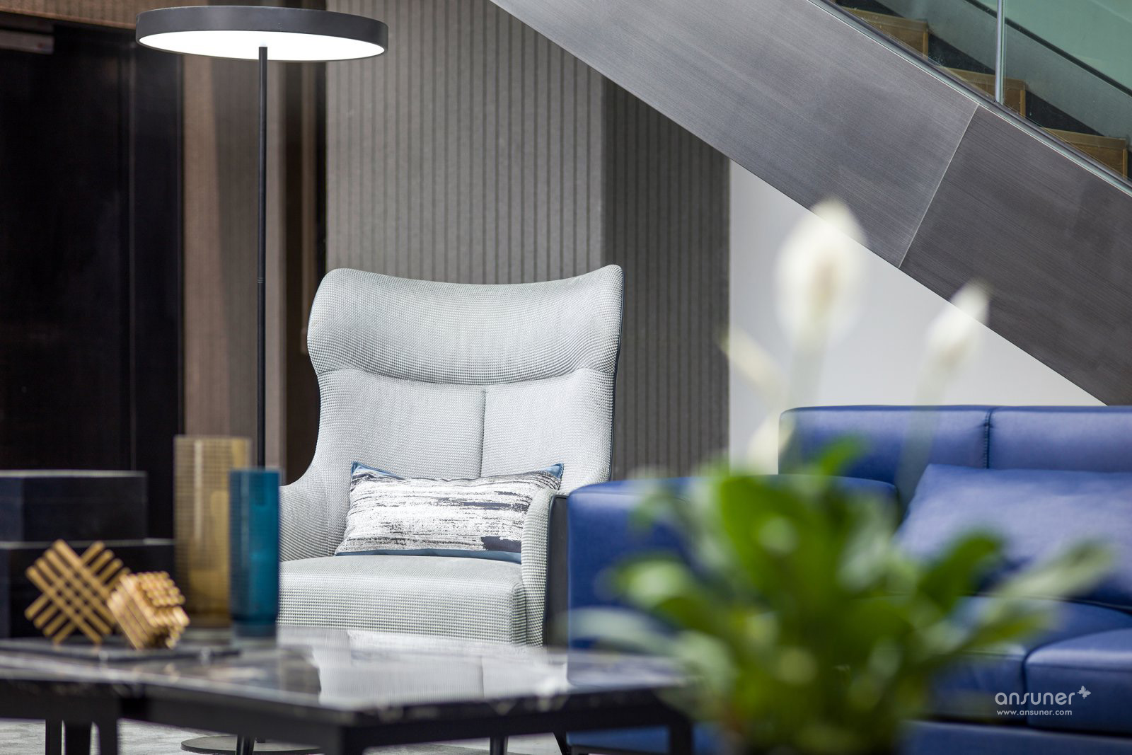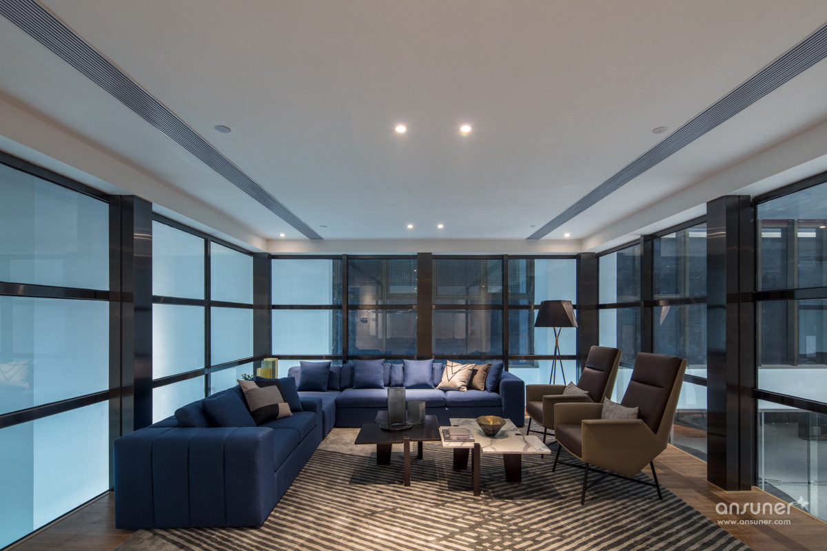 在软装材料的选择上,以具有高级质感的棉麻、PU、绒等面料,配以家具的浅木饰面,结合大理石、陶瓷、水晶以及金属配件营造一种精致大气的商务氛围。一切看似规则,又在规则中不走寻常路。