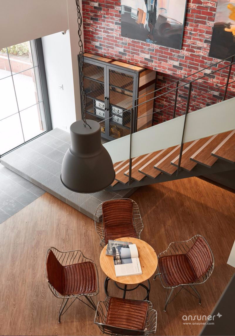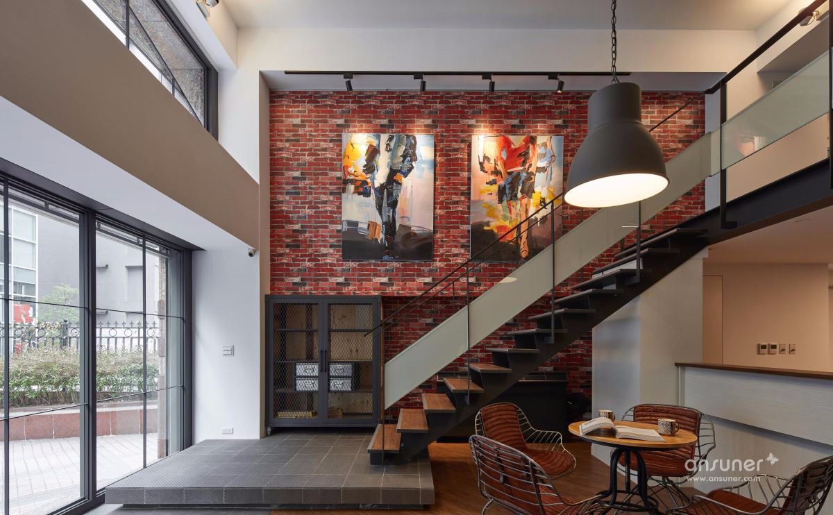 善用挑高空间打造大面积落地窗,并以大量镂空铁件彰显利落气息,设计师更巧妙使用仿红砖壁纸、仿清水模漆以及木纹塑胶地砖,大幅降低装修预算,完成工业风格营造。以一道吧台巧妙分隔接待区与后方会议空间,兼具隐私与置物功用,更利用结构墙下方畸零空间规划柜体,拓增收纳机能。二楼以办公空间为主,以开放设计与纯白色调一扫传统 OA 办公的制式呆版,将有着通风孔设计的无印风置物柜贴齐壁面,让行进动线更加流畅,小型会议室的玻璃隔间更抹除狭小阴暗的可能性。