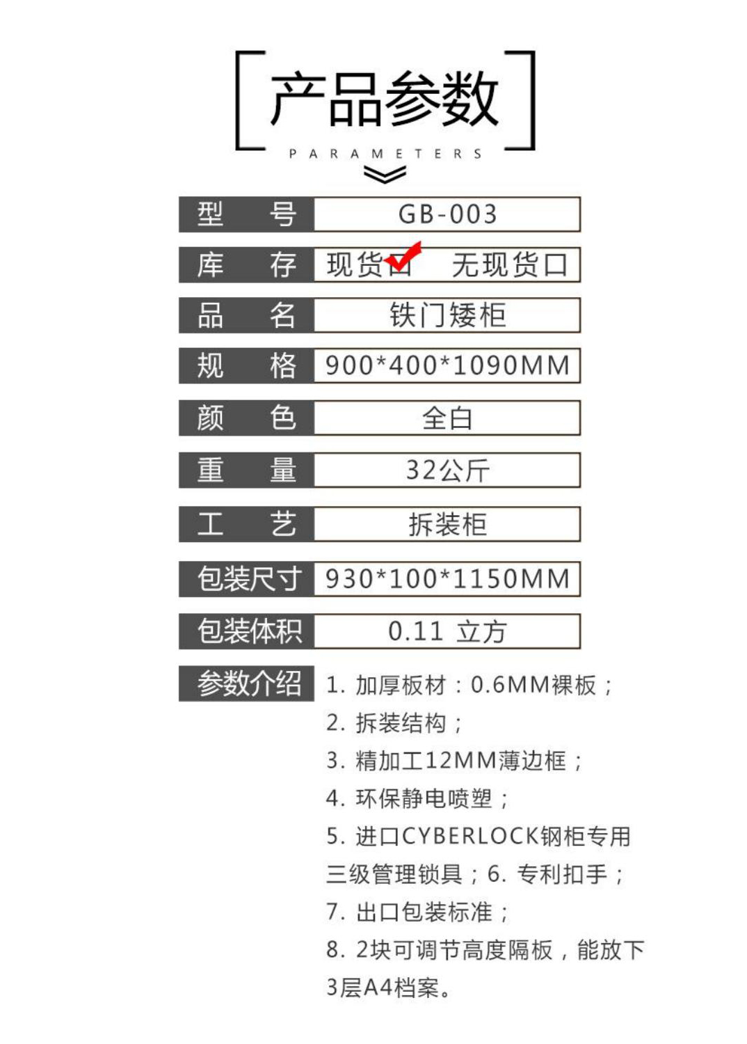 1加厚板材:0.6MM裸板; 2.拆装结构; 3精加工12MM薄边框 4.环保静电喷塑; 5进口CYBERLOCK钢柜专用 三级管理锁具;6.专利扣手; 7.出口包装标准; 8.2块可调节高度隔板,能放下 3层A4档案。