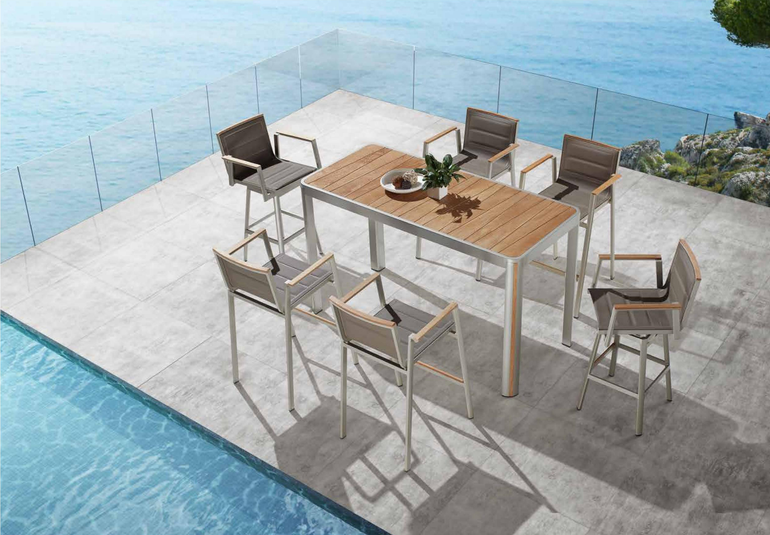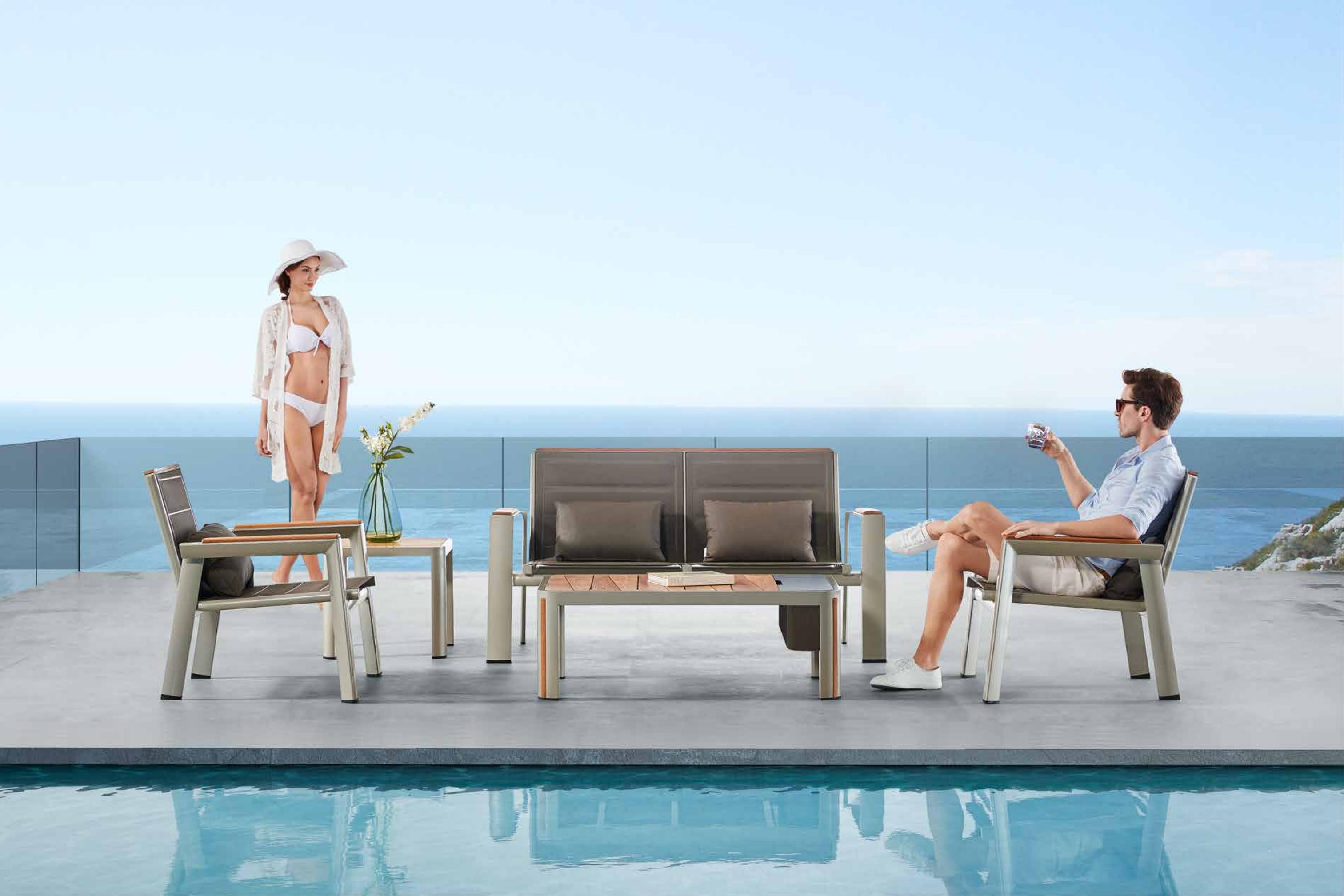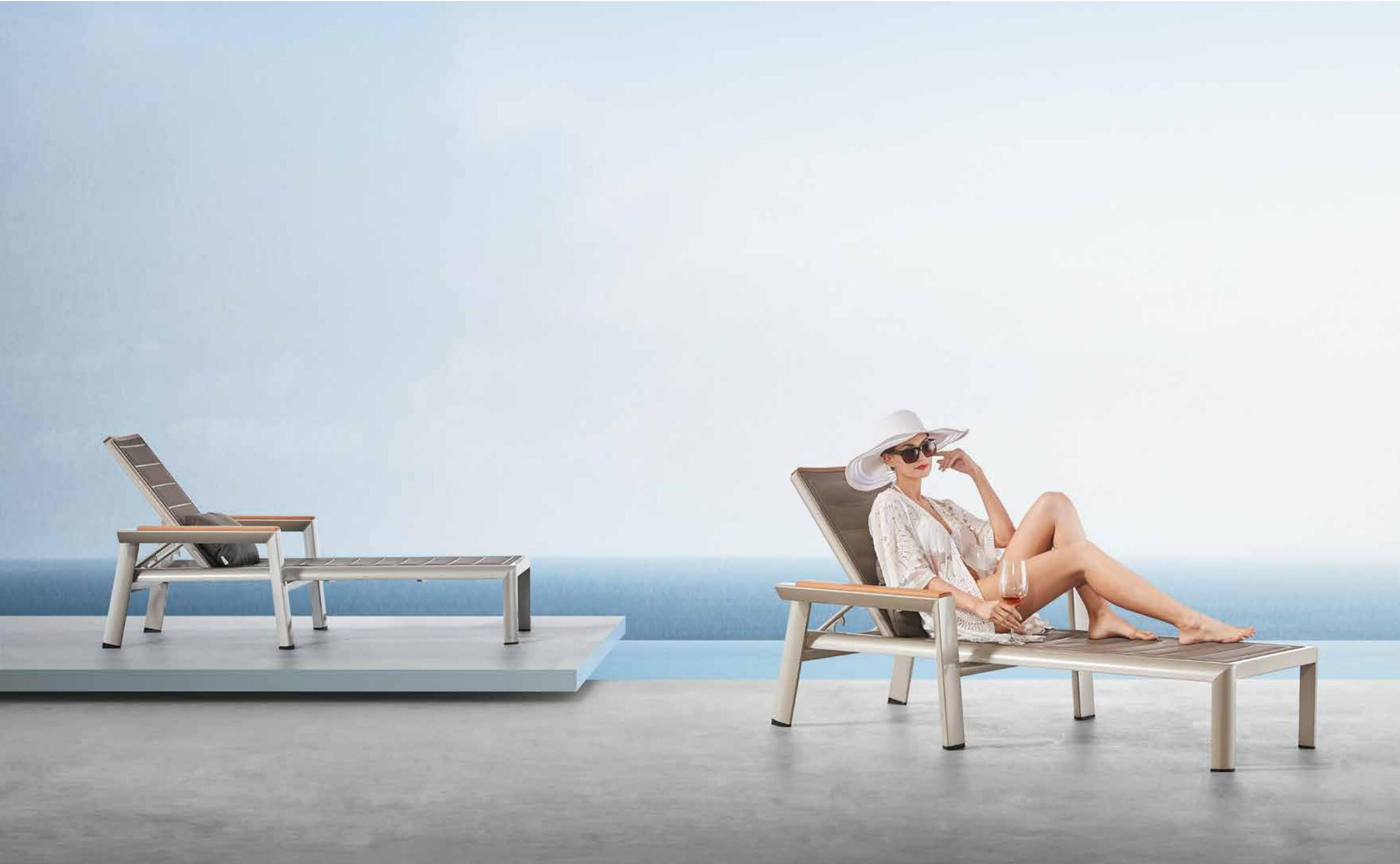 设计灵感:1970年AMC V8 肌肉车,经典中的经典 “经典”---设计灵感是经典中的经典,整体铝镁硅合金外框像极了肌肉车的构造,充满力量; “完美”---横向的热熔缝制处理和竖向的精密线条做点缀,完美结合 “高级”---外框架表面喷涂高级香槟色AkzoNobel牌粉末,坐背体采用双层夹棉原理,令产品立体有充满动感 “多元”---系列产品配套齐全,沙发、餐桌椅、转椅、躺床、高吧餐桌椅、飘床等,满足您的不同生活需求 瑞士手表有极高精准度,而日内瓦系列由此得名。人们一提到户外家具,往往联想到更多的是藤艺的或者是铸铝的款式,如今随着现代设计潮流的繁荣,金属外露的设计也变得愈来愈紧俏。 日内瓦系列的每个产品细节,就像手表一样,都做到了极致,令人无可挑剔。纯天然柚木扶手和桌面,触感真切,随时随地感受大自然。不规则的木板排版,让人耳目一新,记忆犹深。坐背体采用双层夹棉原理,热熔的缝制处理令产品立体又充满动感。 日内瓦系列选用高级香槟色粉末喷制金属主体,灰褐色特斯林面料制作软体结构,当香槟味遇上Taupe色,仿佛陷入纯情,一幕幕经典的爱情故事再次映入眼睑。 日内瓦系列配套有沙发、多人位餐台餐椅、高吧台和吧椅、组合沙发、旋转休闲椅、沙滩躺床及飘床,应有尽有,满足您不同的生活需求。